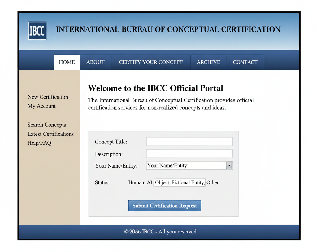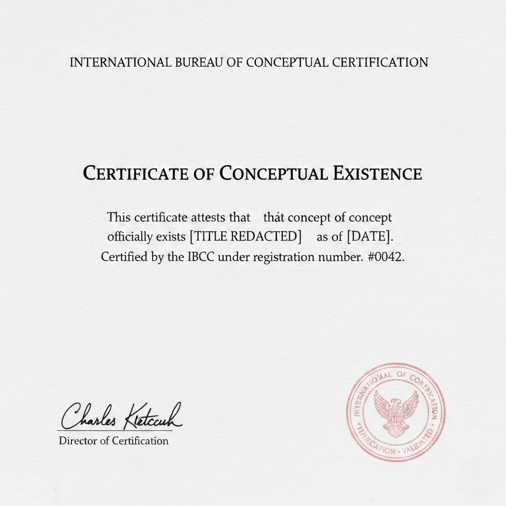 The International Bureau of Conceptual Certification is an institution for legitimizing the immaterial. It certifies the existence of concepts, ideas, and unrealized projects without requiring their prior materialization. By issuing an official certificate for any submitted proposal, the IBCC asserts a radical position: the idea is enough.