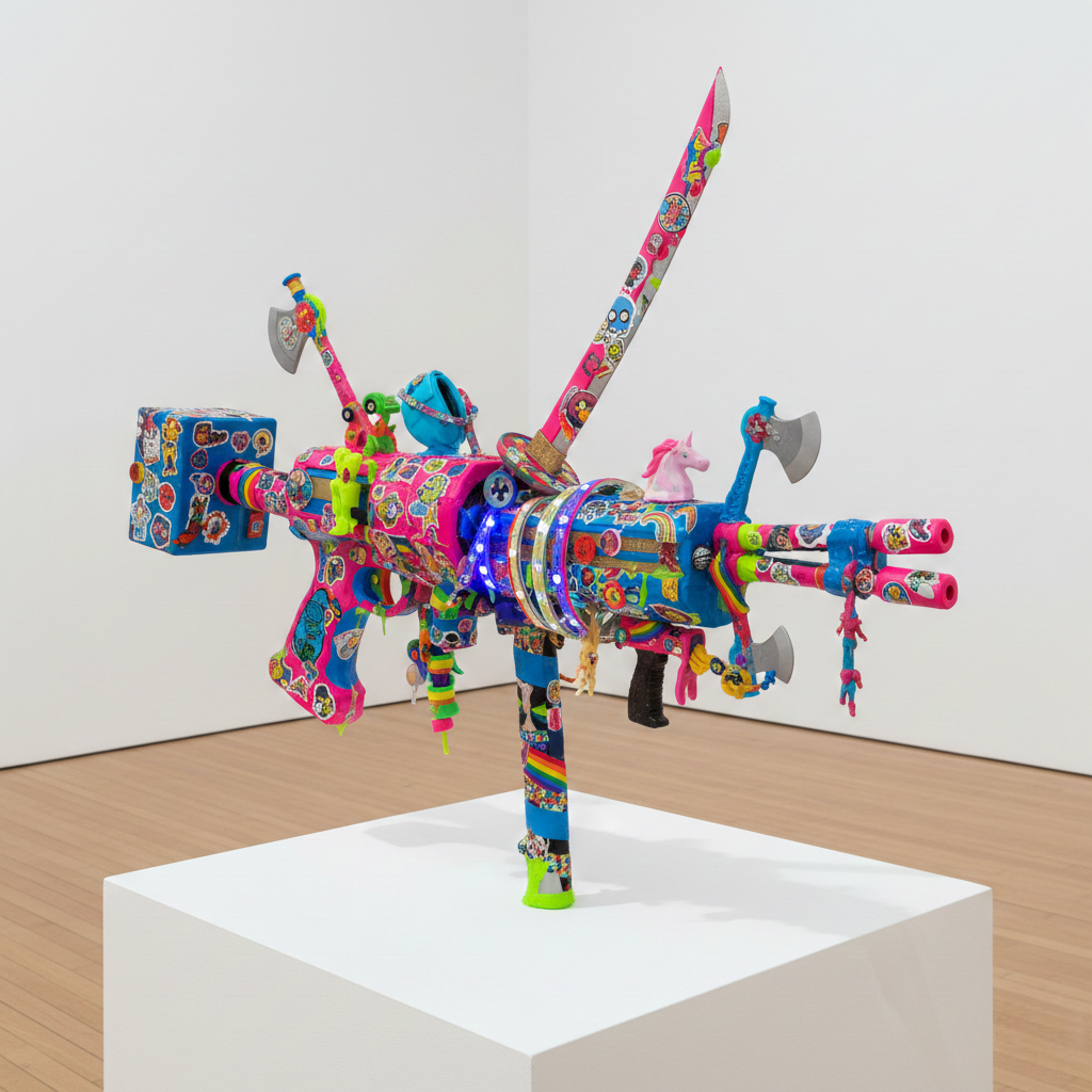 Legendary Gear LVL 999 transforms toy weapons found during my travels into mythical gaming artifacts. Each object is customized, overloaded, pushed to the extreme: parodic aesthetics, obsessive details, unusable power. These weapons evolve according to video game logic, where experience accumulation leads to increasingly spectacular and absurd objects.